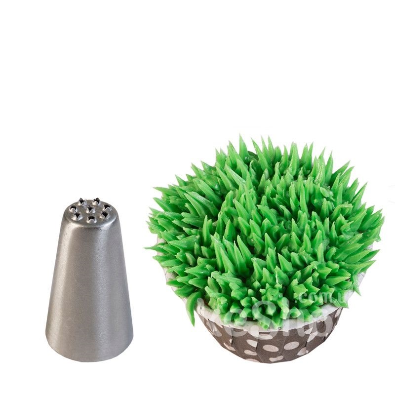 Закрытая конусовидная насадка с небольшими отверстиями на конце. С помощью Травки кондитеры создают рельеф для тортов и пирожных, визуально напоминающий луг с настоящей травой. Также этот тип насадки можно использовать при необходимости сымитировать шерсть животного.